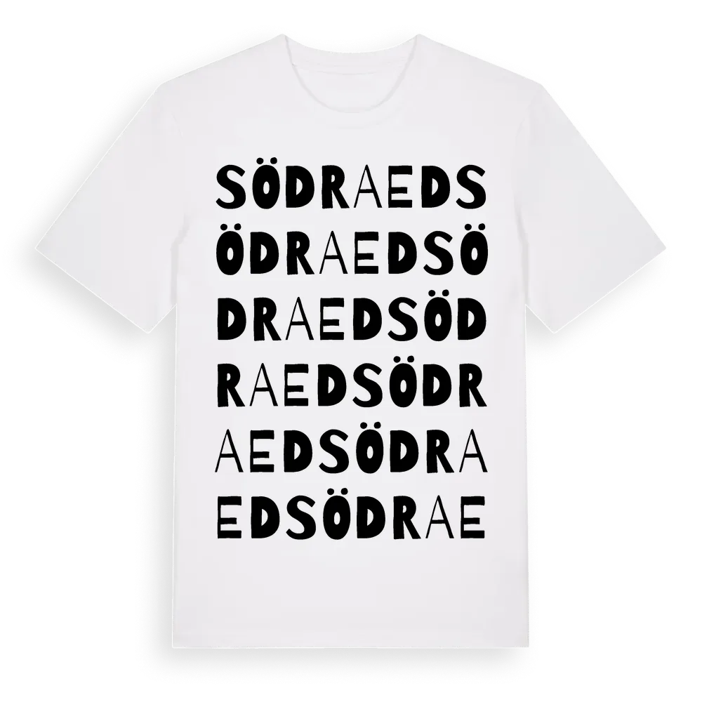 Södra Ed ordlek t-shirt är inspirerad av byn Södra Ed i Värmlands län, Sverige. Tröjan är designad för dig som har en speciell koppling till platsen – oavsett om du bor här, har rötterna här eller bara älskar Södra Ed.