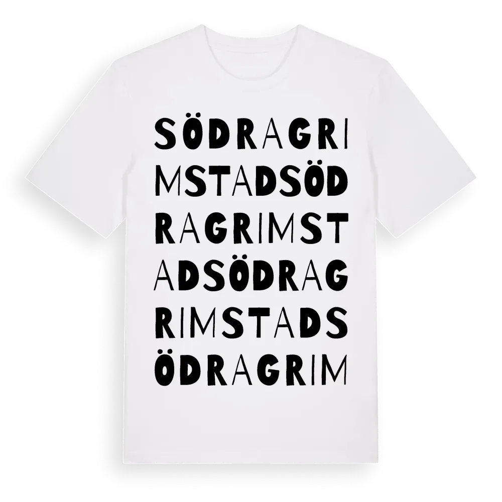 Södra Grimstad ordlek t-shirt är inspirerad av byn Södra Grimstad i Värmlands län, Sverige. Tröjan är designad för dig som har en speciell koppling till platsen – oavsett om du bor här, har rötterna här eller bara älskar Södra Grimstad.