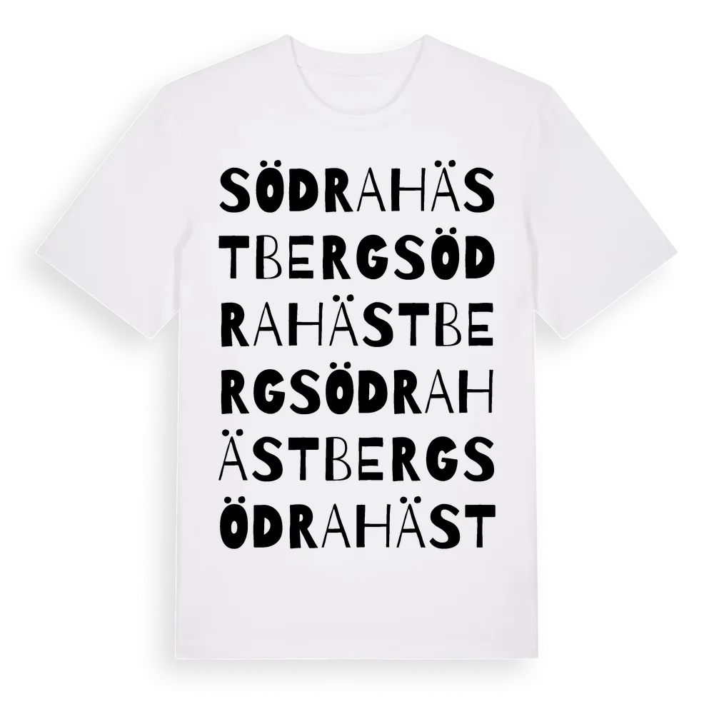 Södra Hästberg ordlek t-shirt är inspirerad av Södra Hästberg i Värmlands län, Sverige. Tröjan är designad för dig som har en speciell koppling till platsen – oavsett om du bor här, har rötterna här eller bara älskar Södra Hästberg.
