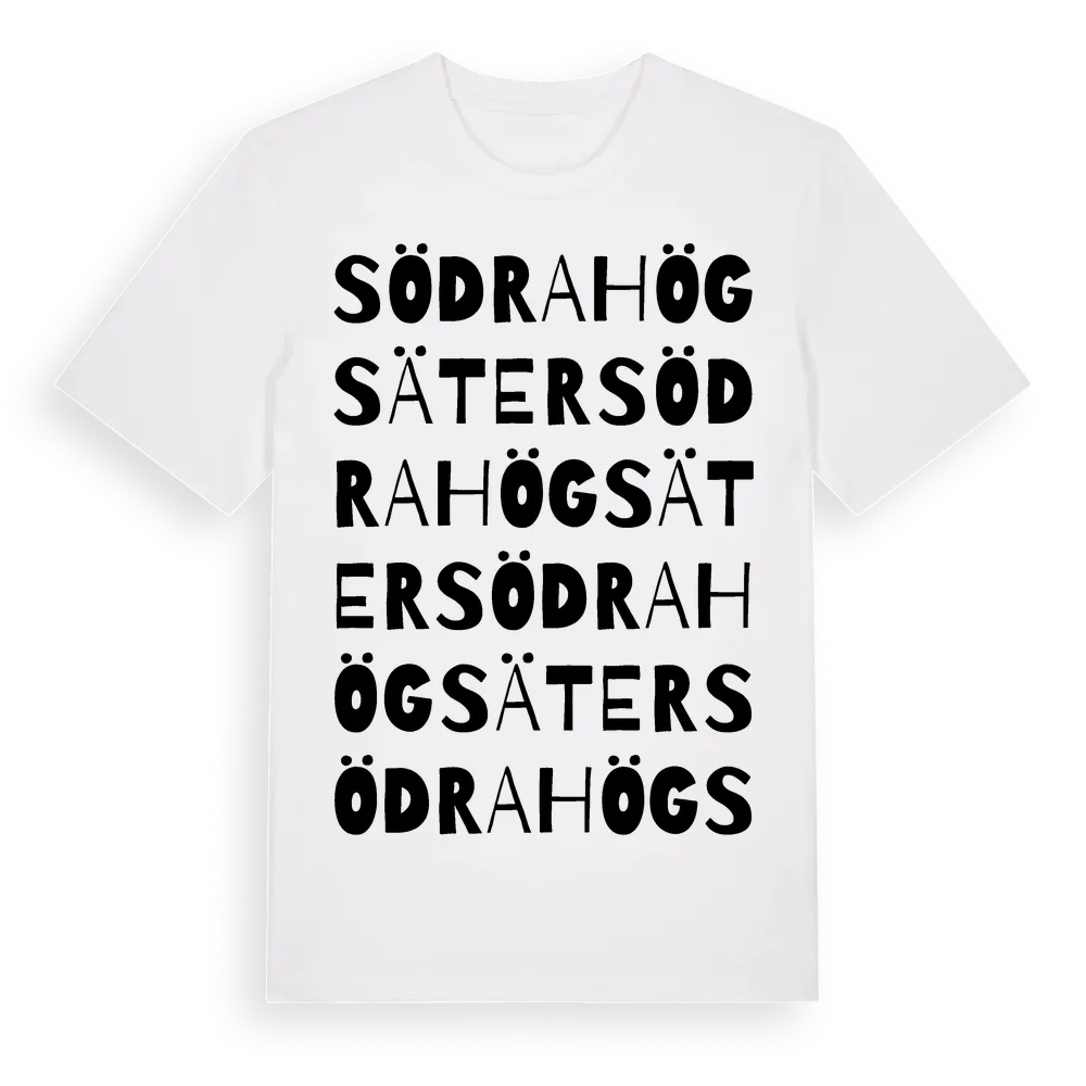 Södra Högsäter ordlek t-shirt är inspirerad av byn Södra Högsäter i Värmlands län, Sverige. Tröjan är designad för dig som har en speciell koppling till platsen – oavsett om du bor här, har rötterna här eller bara älskar Södra Högsäter.