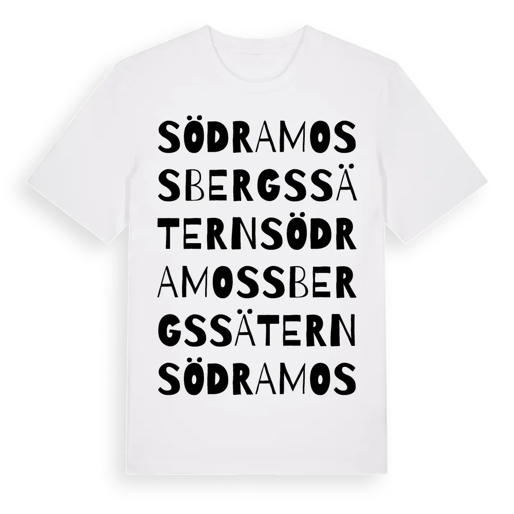 Södra Mossbergssätern ordlek t-shirt är inspirerad av Södra Mossbergssätern i Värmlands län, Sverige. Tröjan är designad för dig som har en speciell koppling till platsen – oavsett om du bor här, har rötterna här eller bara älskar Södra Mossbergssätern.