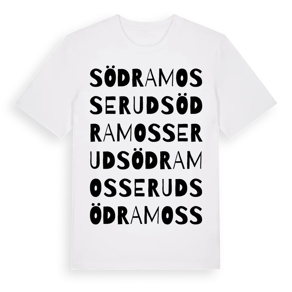 Södra Mosserud ordlek t-shirt är inspirerad av Södra Mosserud i Värmlands län, Sverige. Tröjan är designad för dig som har en speciell koppling till platsen – oavsett om du bor här, har rötterna här eller bara älskar Södra Mosserud.