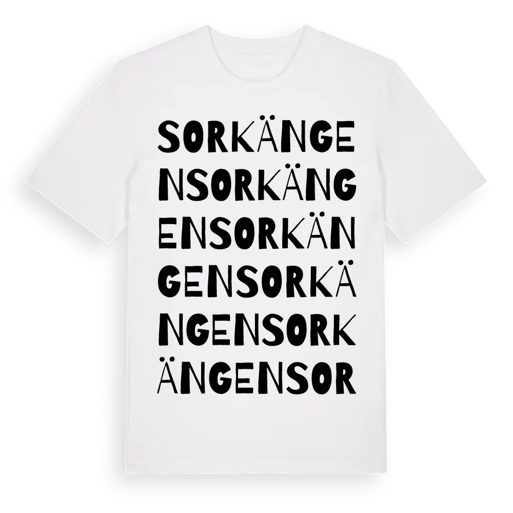 Sorkängen ordlek t-shirt är inspirerad av Sorkängen i Värmlands län, Sverige. Tröjan är designad för dig som har en speciell koppling till platsen – oavsett om du bor här, har rötterna här eller bara älskar Sorkängen.
