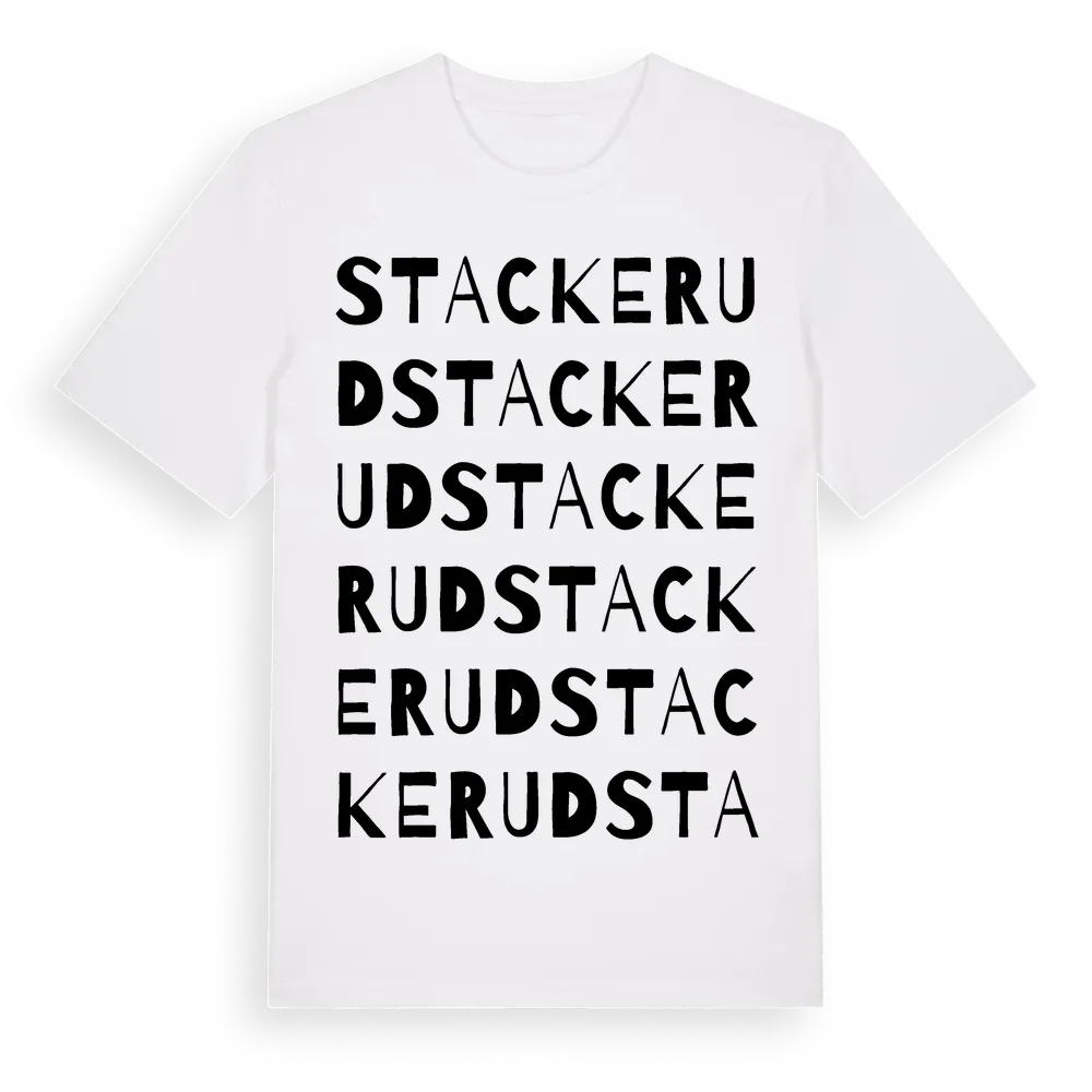 Stackerud ordlek t-shirt är inspirerad av stadsdelen Stackerud i Värmlands län, Sverige. Tröjan är designad för dig som har en speciell koppling till platsen – oavsett om du bor här, har rötterna här eller bara älskar Stackerud.