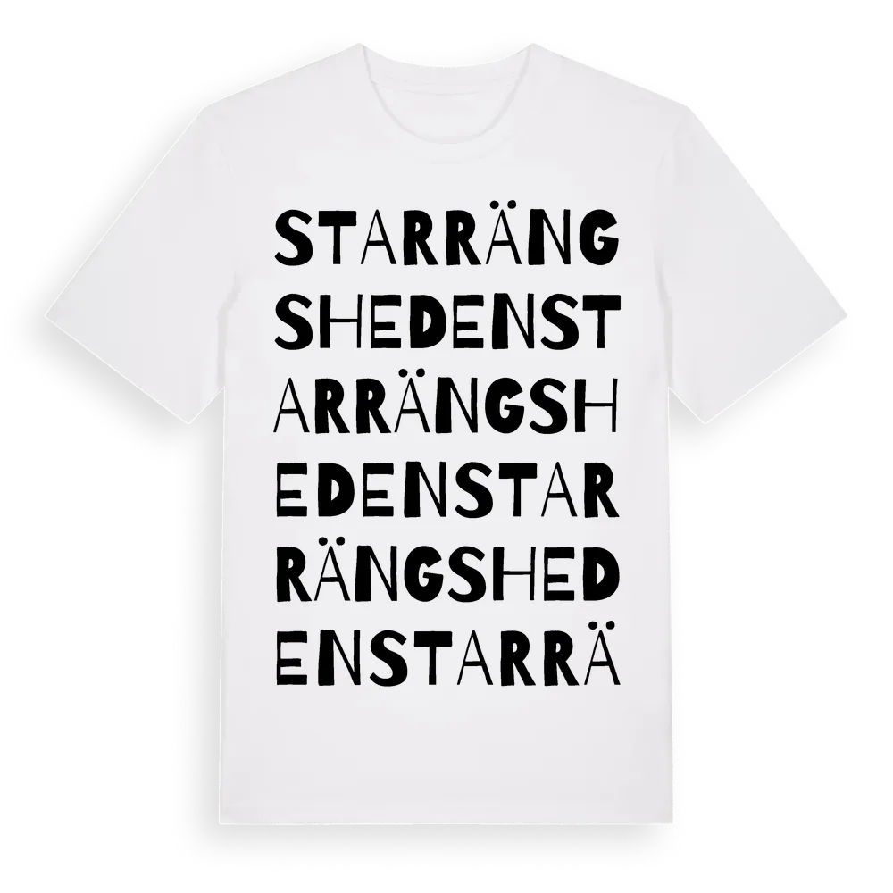 Starrängsheden ordlek t-shirt är inspirerad av Starrängsheden i Värmlands län, Sverige. Tröjan är designad för dig som har en speciell koppling till platsen – oavsett om du bor här, har rötterna här eller bara älskar Starrängsheden.