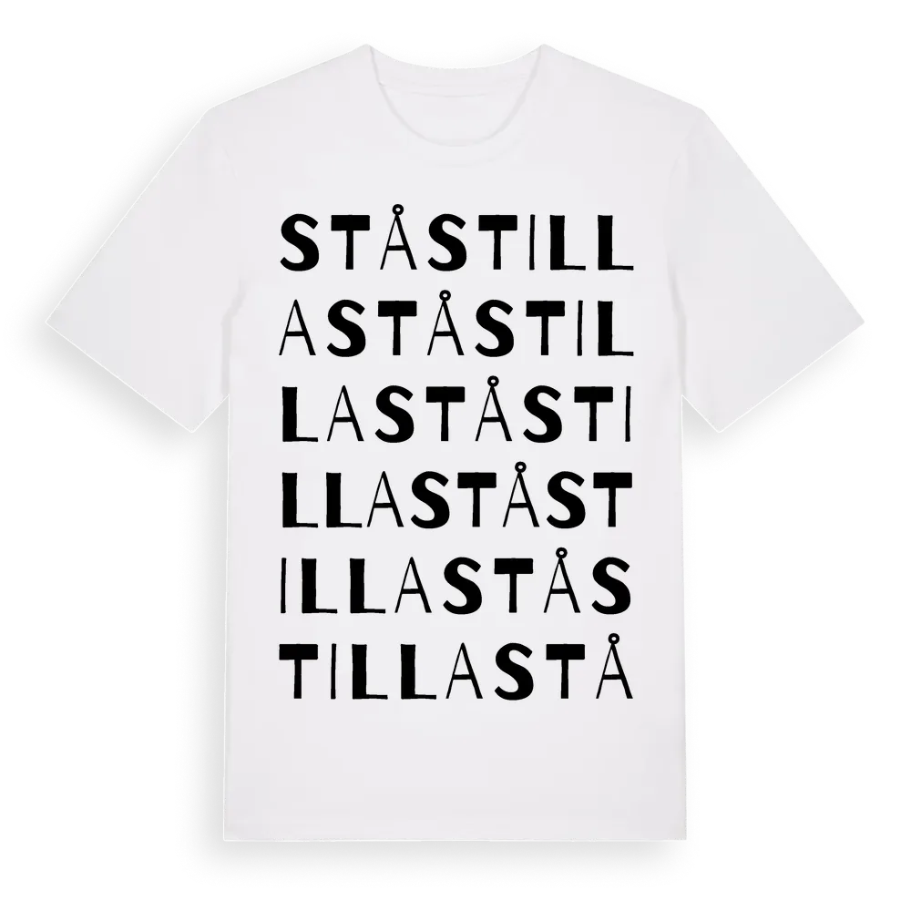 Ståstilla ordlek t-shirt är inspirerad av Ståstilla i Värmlands län, Sverige. Tröjan är designad för dig som har en speciell koppling till platsen – oavsett om du bor här, har rötterna här eller bara älskar Ståstilla.