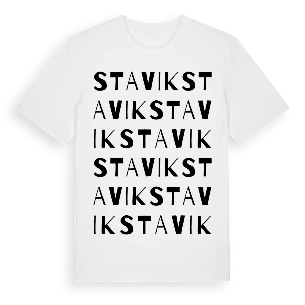 Stavik ordlek t-shirt är inspirerad av byn Stavik i Värmlands län, Sverige. Tröjan är designad för dig som har en speciell koppling till platsen – oavsett om du bor här, har rötterna här eller bara älskar Stavik.