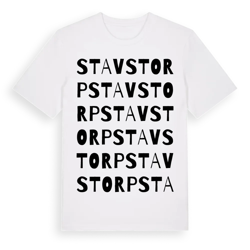 Stavstorp ordlek t-shirt är inspirerad av Stavstorp i Värmlands län, Sverige. Tröjan är designad för dig som har en speciell koppling till platsen – oavsett om du bor här, har rötterna här eller bara älskar Stavstorp.