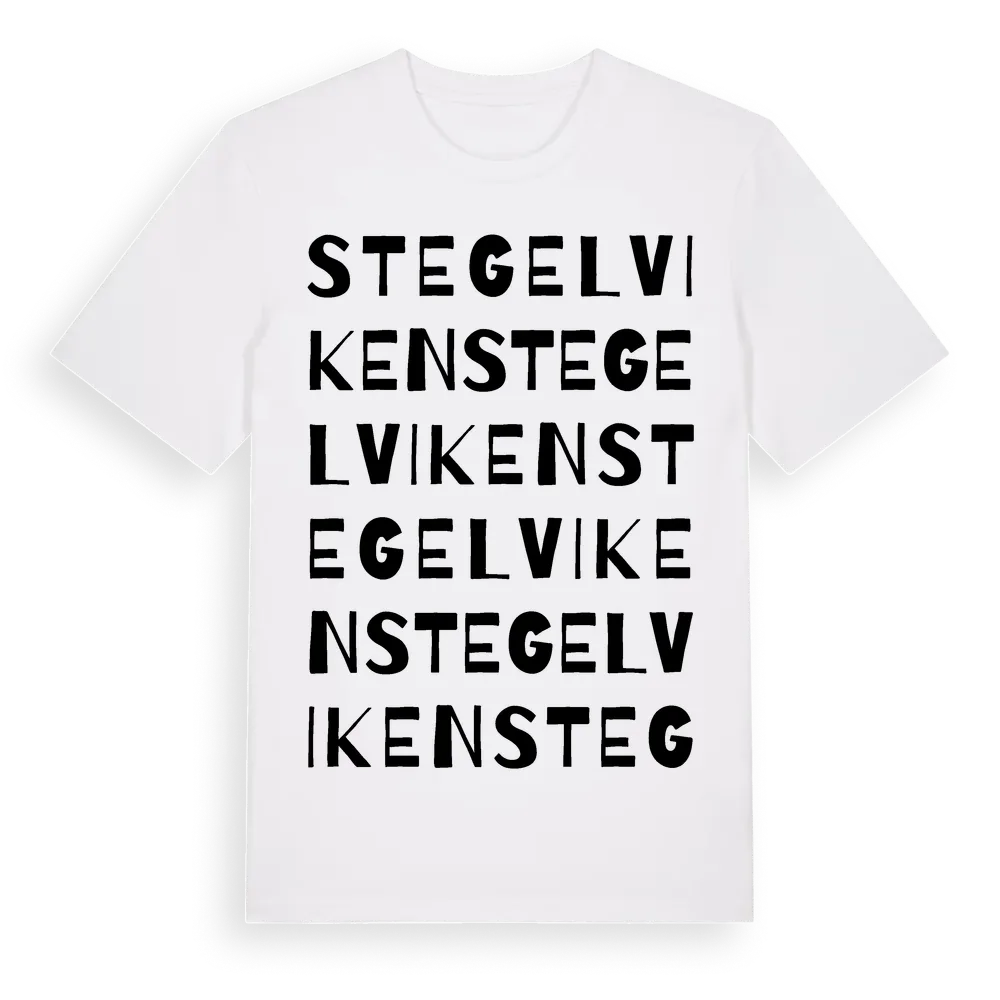 Stegelviken ordlek t-shirt är inspirerad av Stegelviken i Värmlands län, Sverige. Tröjan är designad för dig som har en speciell koppling till platsen – oavsett om du bor här, har rötterna här eller bara älskar Stegelviken.