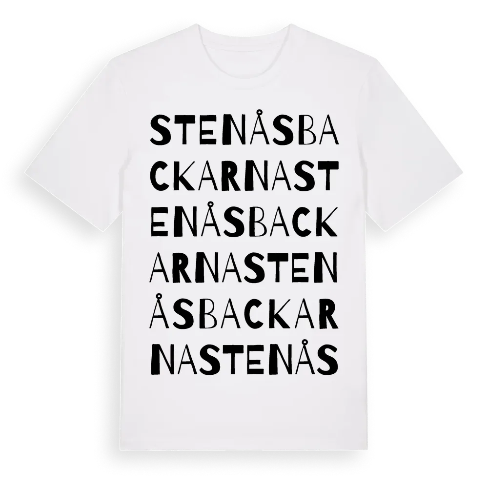 Stenåsbackarna ordlek t-shirt är inspirerad av Stenåsbackarna i Värmlands län, Sverige. Tröjan är designad för dig som har en speciell koppling till platsen – oavsett om du bor här, har rötterna här eller bara älskar Stenåsbackarna.