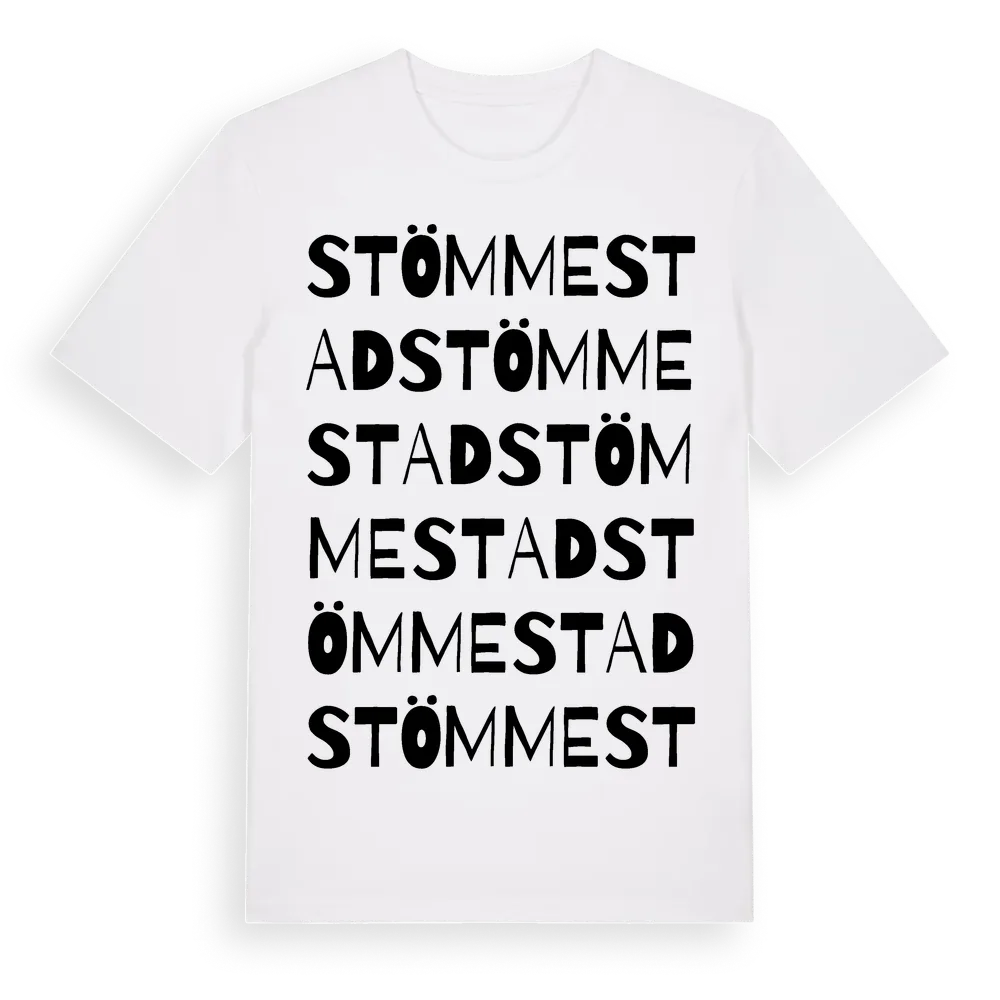 Stömmestad ordlek t-shirt är inspirerad av Stömmestad i Värmlands län, Sverige. Tröjan är designad för dig som har en speciell koppling till platsen – oavsett om du bor här, har rötterna här eller bara älskar Stömmestad.