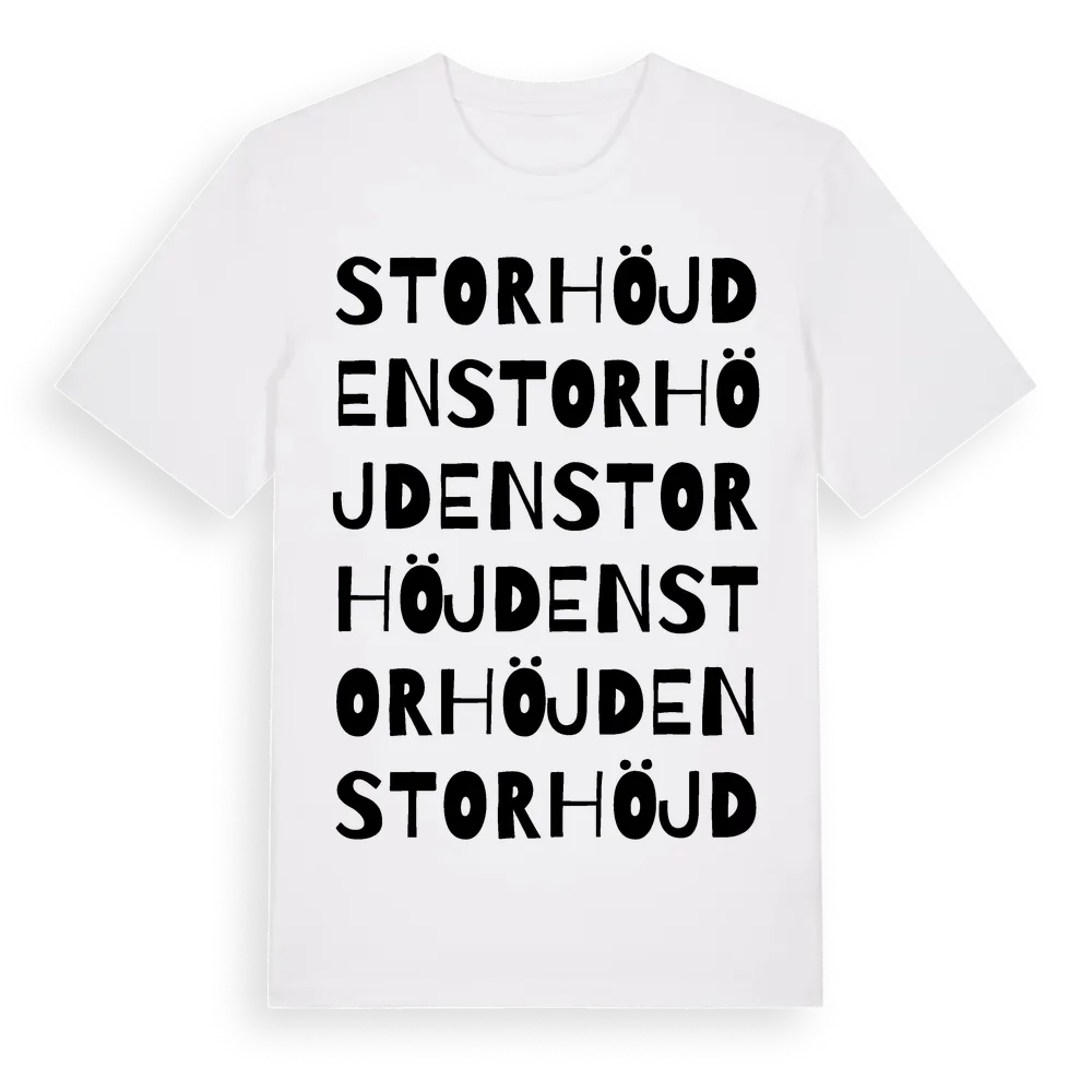 Storhöjden ordlek t-shirt är inspirerad av Storhöjden i Värmlands län, Sverige. Tröjan är designad för dig som har en speciell koppling till platsen – oavsett om du bor här, har rötterna här eller bara älskar Storhöjden.