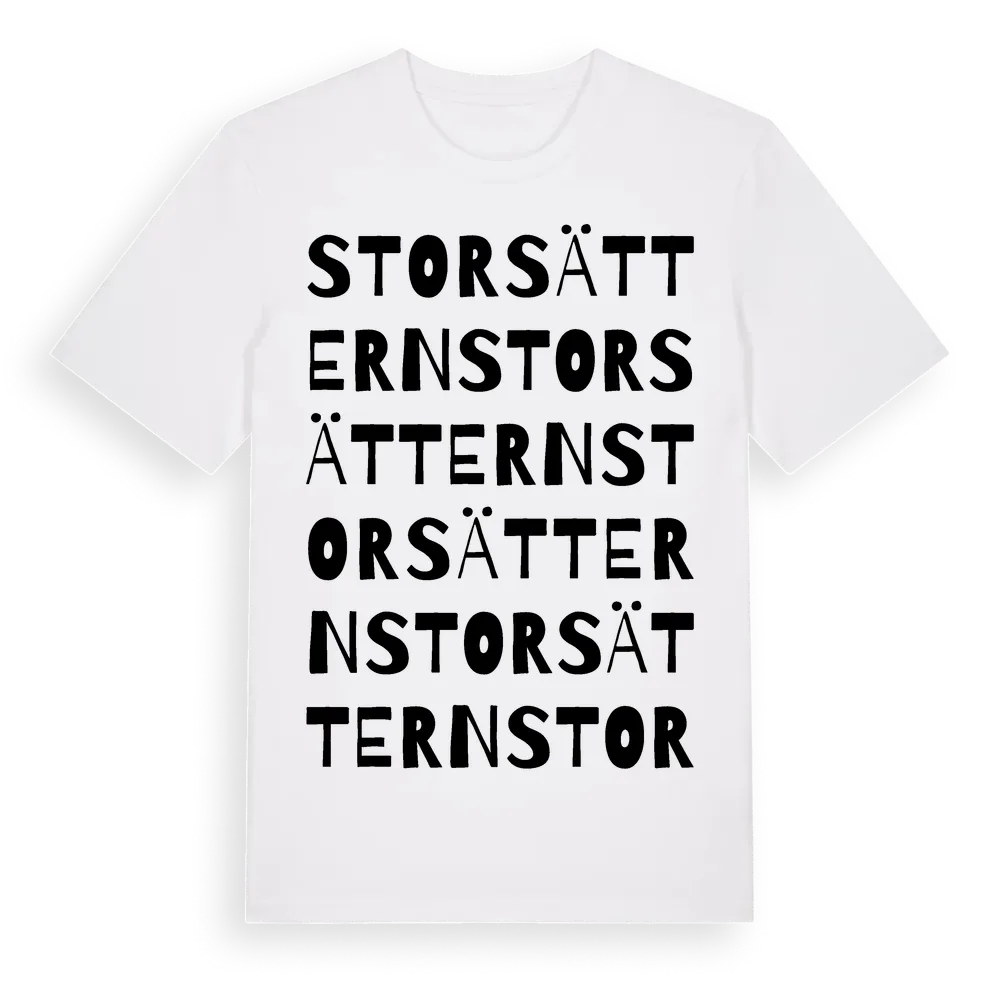 Storsättern ordlek t-shirt är inspirerad av Storsättern i Värmlands län, Sverige. Tröjan är designad för dig som har en speciell koppling till platsen – oavsett om du bor här, har rötterna här eller bara älskar Storsättern.
