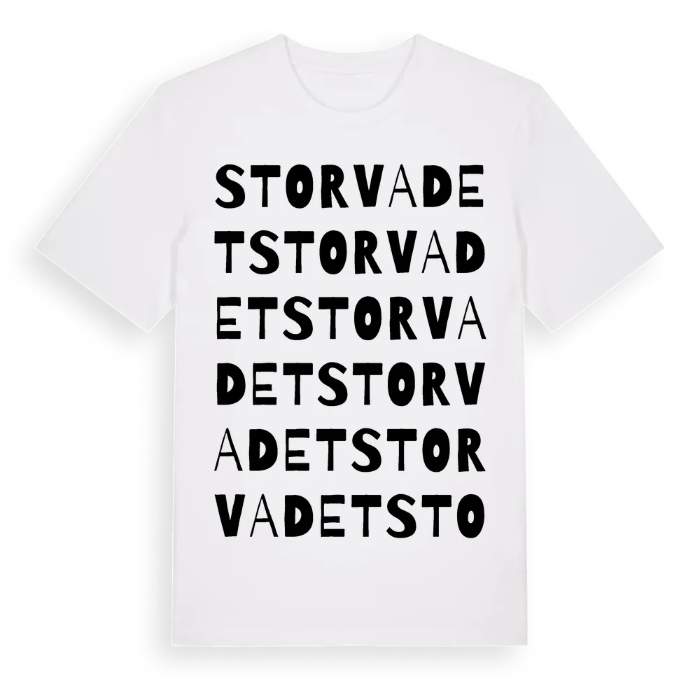 Storvadet ordlek t-shirt är inspirerad av Storvadet i Värmlands län, Sverige. Tröjan är designad för dig som har en speciell koppling till platsen – oavsett om du bor här, har rötterna här eller bara älskar Storvadet.