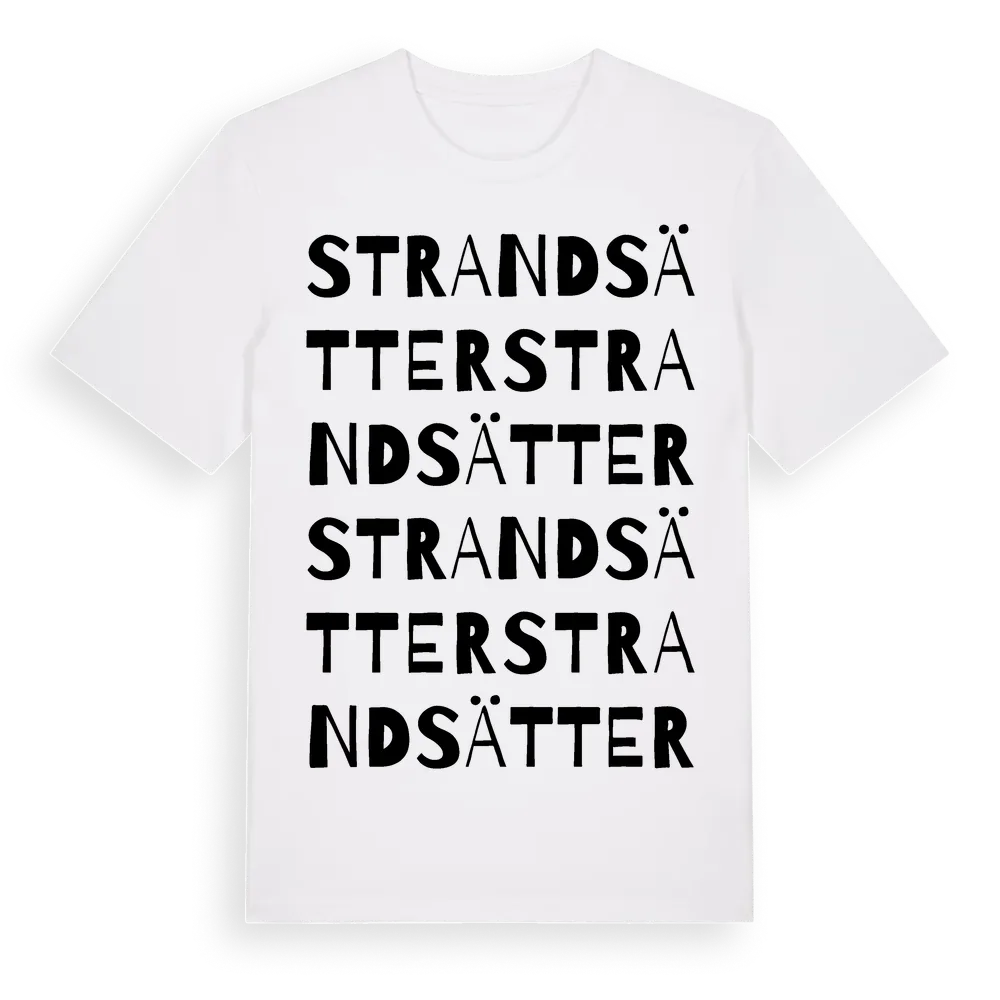 Strandsätter ordlek t-shirt är inspirerad av Strandsätter i Värmlands län, Sverige. Tröjan är designad för dig som har en speciell koppling till platsen – oavsett om du bor här, har rötterna här eller bara älskar Strandsätter.