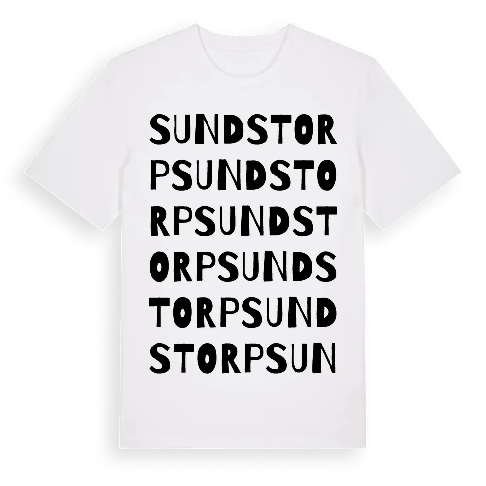 Sundstorp ordlek t-shirt är inspirerad av byn Sundstorp i Värmlands län, Sverige. Tröjan är designad för dig som har en speciell koppling till platsen – oavsett om du bor här, har rötterna här eller bara älskar Sundstorp.