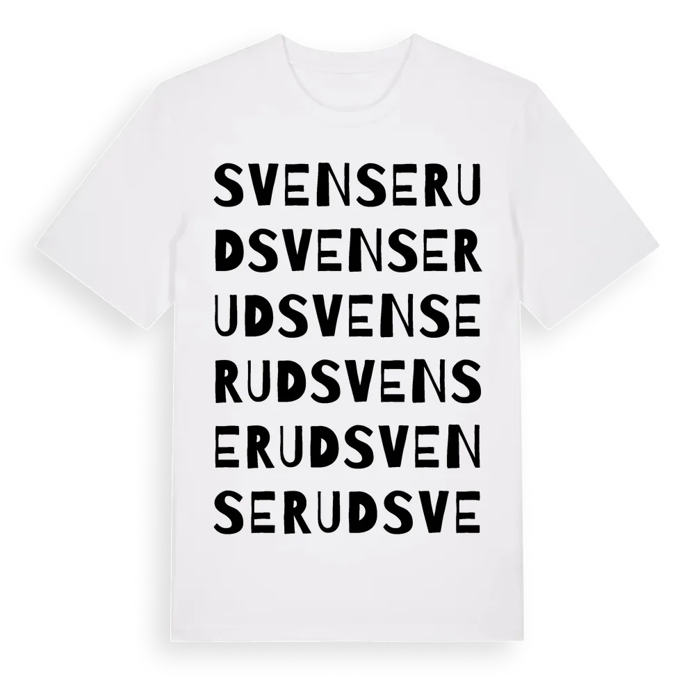 Svenserud ordlek t-shirt är inspirerad av byn Svenserud i Värmlands län, Sverige. Tröjan är designad för dig som har en speciell koppling till platsen – oavsett om du bor här, har rötterna här eller bara älskar Svenserud.