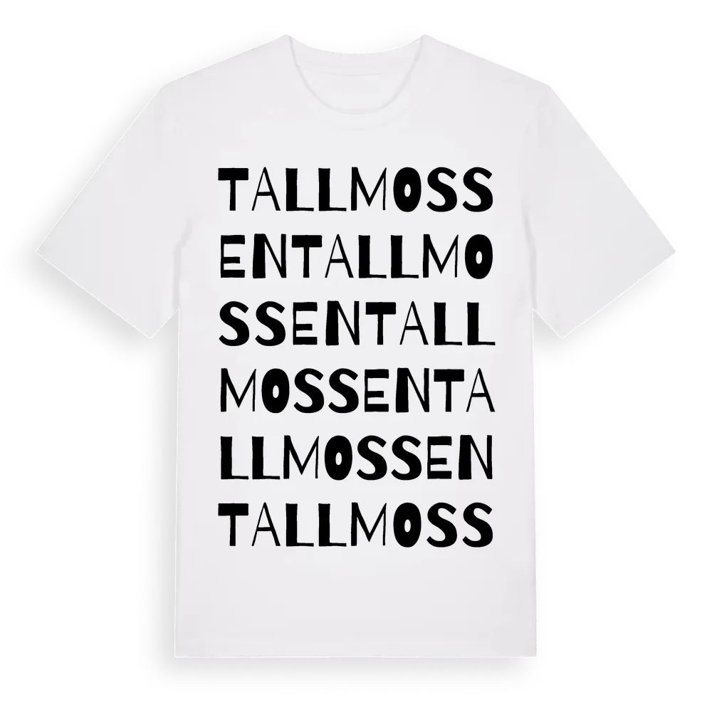 En ordlek byggd på Tallmossens namn. Subtilt och klurig – ett motiv som bara de som verkligen känner platsen fullt ut förstår. Premium bomull, unisex – från Tallmossen i Värmlands län.