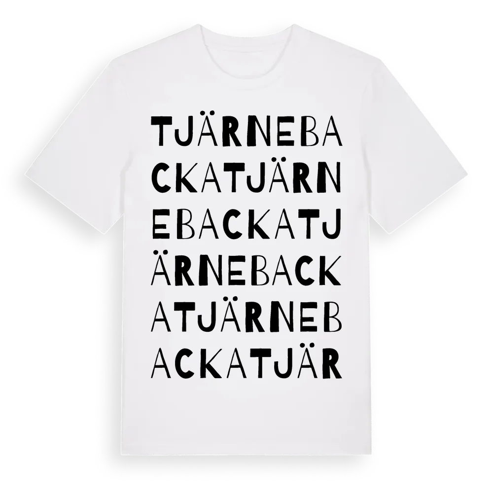 Tjärnebacka ordlek t-shirt är inspirerad av Tjärnebacka i Värmlands län, Sverige. Tröjan är designad för dig som har en speciell koppling till platsen – oavsett om du bor här, har rötterna här eller bara älskar Tjärnebacka.