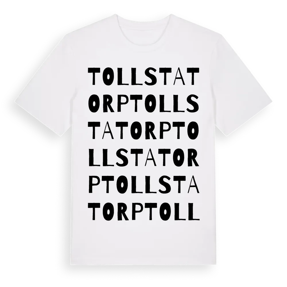 Tollstatorp ordlek t-shirt är inspirerad av byn Tollstatorp i Värmlands län, Sverige. Tröjan är designad för dig som har en speciell koppling till platsen – oavsett om du bor här, har rötterna här eller bara älskar Tollstatorp.