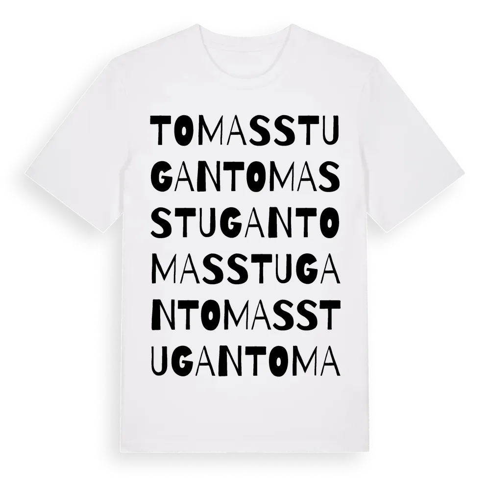 Tomasstugan ordlek t-shirt är inspirerad av Tomasstugan i Värmlands län, Sverige. Tröjan är designad för dig som har en speciell koppling till platsen – oavsett om du bor här, har rötterna här eller bara älskar Tomasstugan.