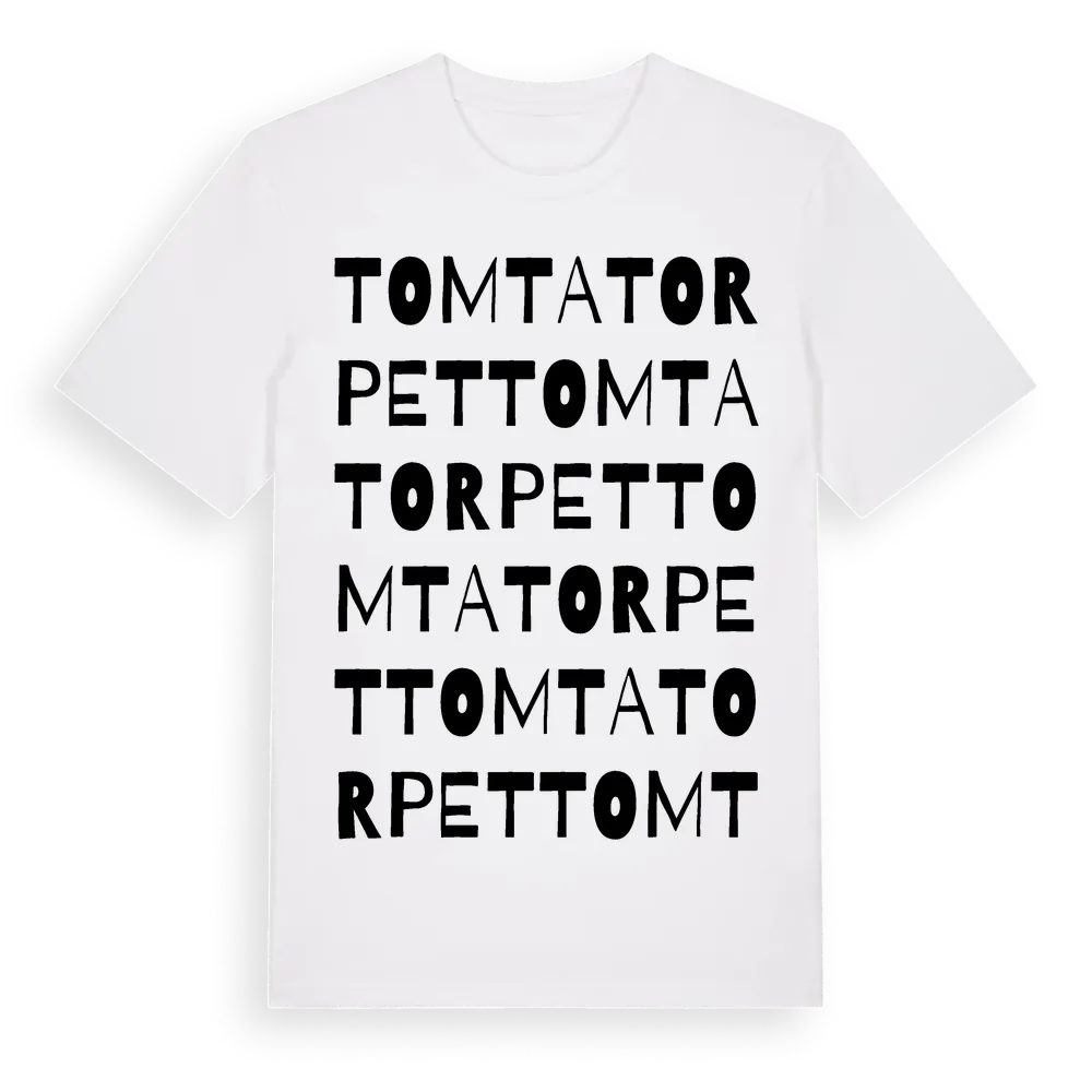 Tomtatorpet ordlek t-shirt är inspirerad av Tomtatorpet i Värmlands län, Sverige. Tröjan är designad för dig som har en speciell koppling till platsen – oavsett om du bor här, har rötterna här eller bara älskar Tomtatorpet.