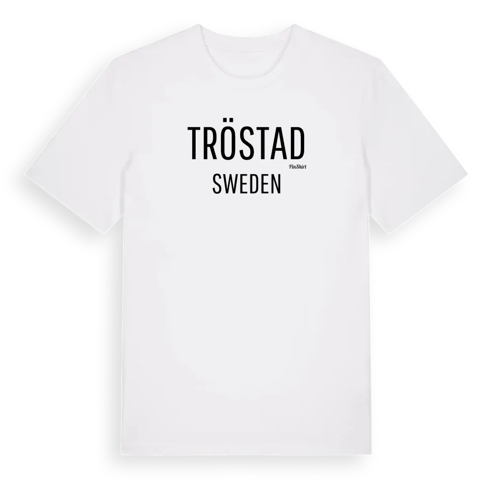 Tröstad i Sverige – ett rakt och tydligt utrop om var du hör hemma. Inget mer behövs. Premium bomull, unisex – från byn Tröstad i Värmlands län.