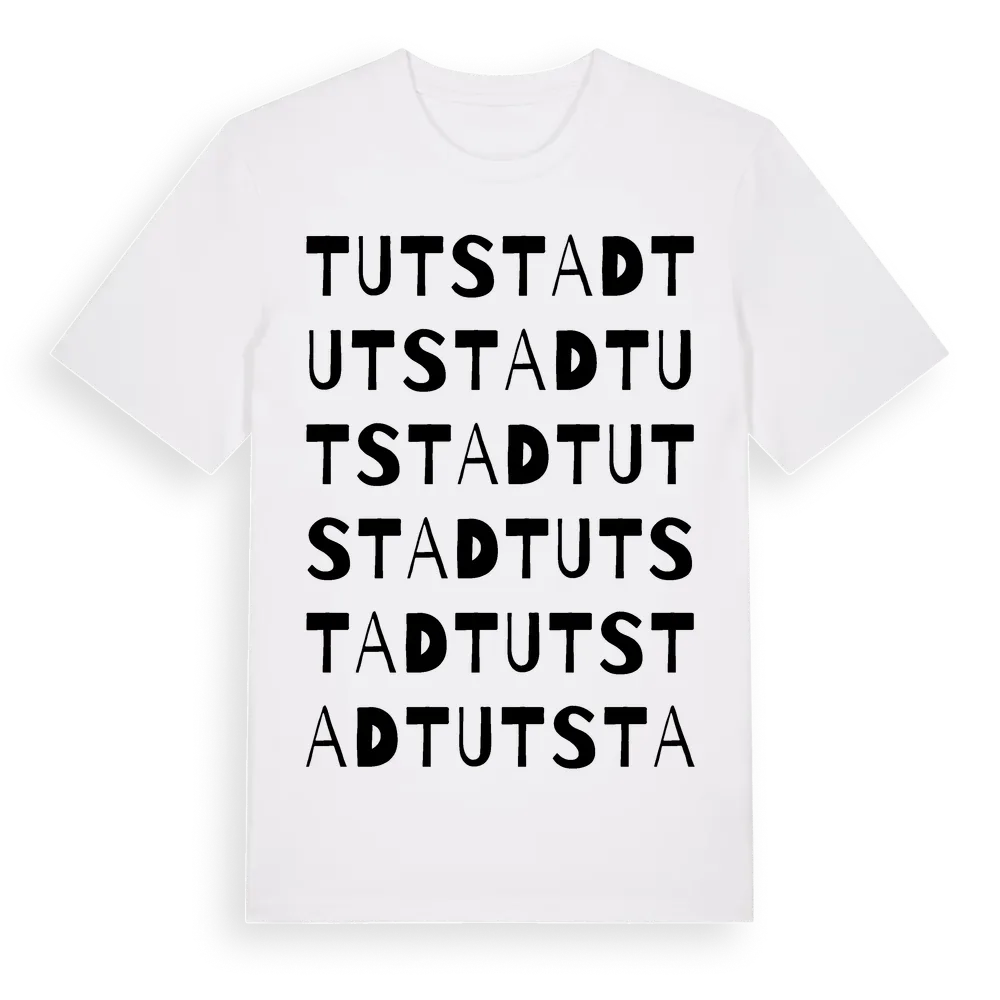Tutstad ordlek t-shirt är inspirerad av Tutstad i Värmlands län, Sverige. Tröjan är designad för dig som har en speciell koppling till platsen – oavsett om du bor här, har rötterna här eller bara älskar Tutstad.