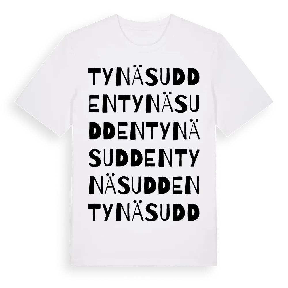 En ordlek byggd på Tynäsuddens namn. Subtilt och klurig – ett motiv som bara de som verkligen känner platsen fullt ut förstår. Premium bomull, unisex – från Tynäsudden i Värmlands län.