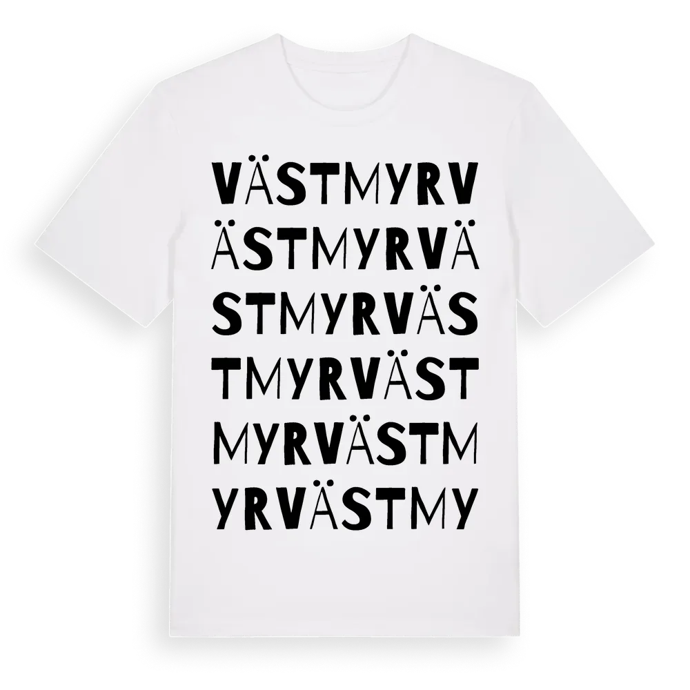 Västmyr ordlek t-shirt är inspirerad av byn Västmyr i Värmlands län, Sverige. Tröjan är designad för dig som har en speciell koppling till platsen – oavsett om du bor här, har rötterna här eller bara älskar Västmyr.