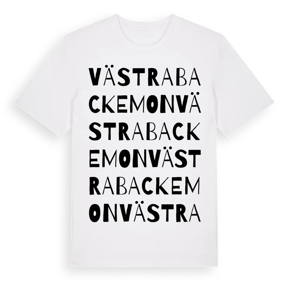 Västra Backemon ordlek t-shirt är inspirerad av Västra Backemon i Värmlands län, Sverige. Tröjan är designad för dig som har en speciell koppling till platsen – oavsett om du bor här, har rötterna här eller bara älskar Västra Backemon.