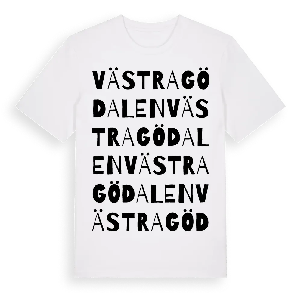 Västra Gödalen ordlek t-shirt är inspirerad av Västra Gödalen i Värmlands län, Sverige. Tröjan är designad för dig som har en speciell koppling till platsen – oavsett om du bor här, har rötterna här eller bara älskar Västra Gödalen.