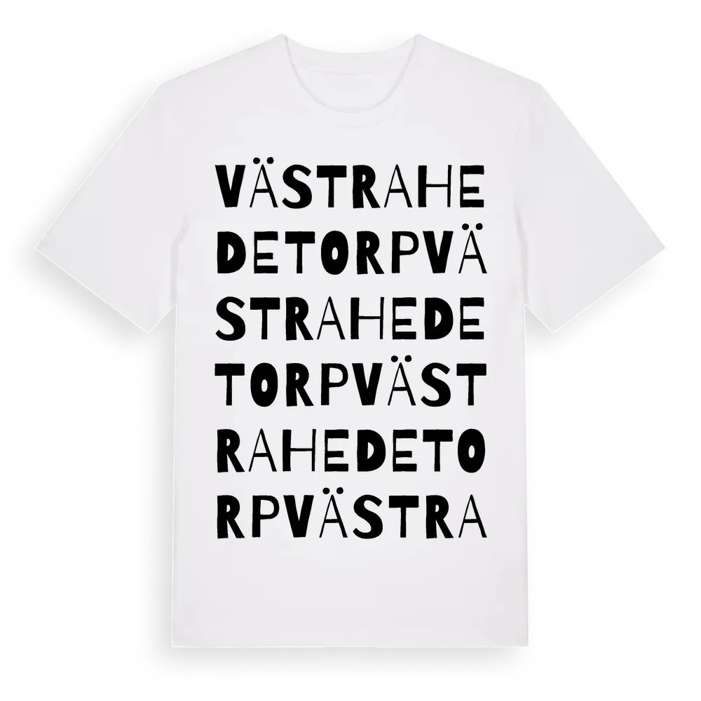 Västra Hedetorp ordlek t-shirt är inspirerad av byn Västra Hedetorp i Värmlands län, Sverige. Tröjan är designad för dig som har en speciell koppling till platsen – oavsett om du bor här, har rötterna här eller bara älskar Västra Hedetorp.