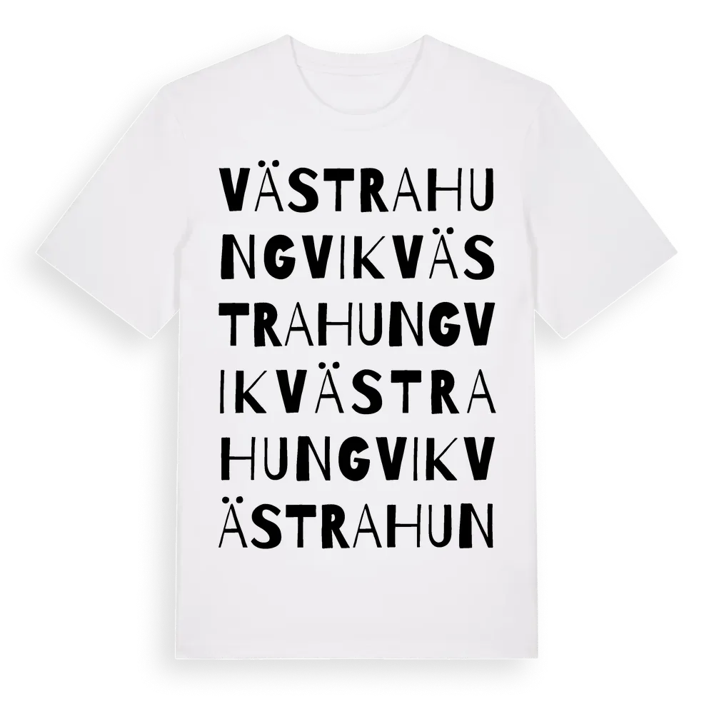 Västra Hungvik ordlek t-shirt är inspirerad av byn Västra Hungvik i Värmlands län, Sverige. Tröjan är designad för dig som har en speciell koppling till platsen – oavsett om du bor här, har rötterna här eller bara älskar Västra Hungvik.