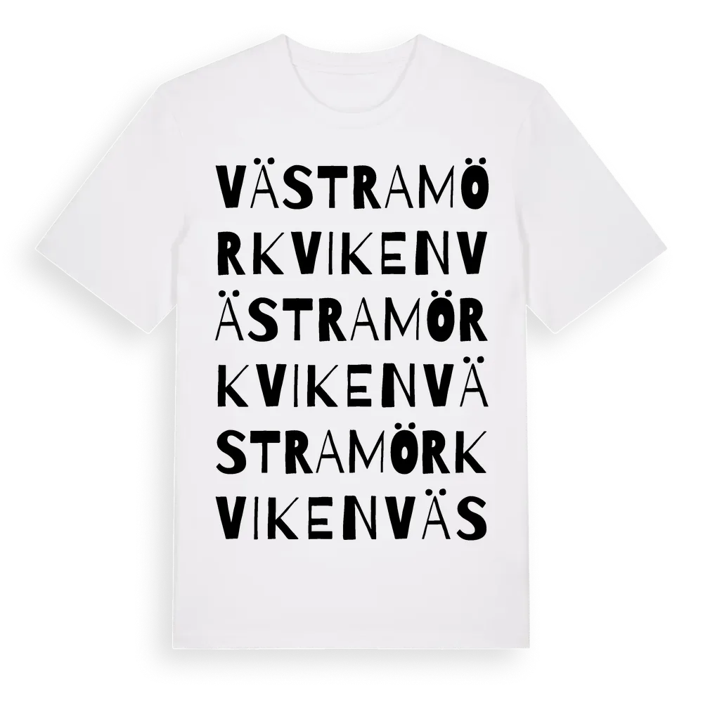 Västra Mörkviken ordlek t-shirt är inspirerad av byn Västra Mörkviken i Värmlands län, Sverige. Tröjan är designad för dig som har en speciell koppling till platsen – oavsett om du bor här, har rötterna här eller bara älskar Västra Mörkviken.
