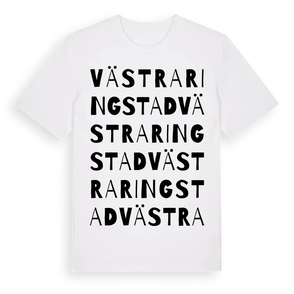 Västra Ringstad ordlek t-shirt är inspirerad av Västra Ringstad i Värmlands län, Sverige. Tröjan är designad för dig som har en speciell koppling till platsen – oavsett om du bor här, har rötterna här eller bara älskar Västra Ringstad.
