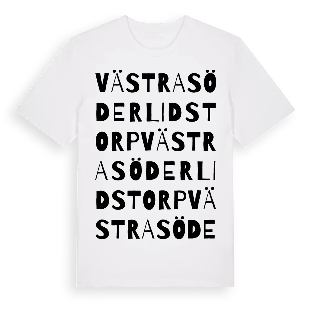 Västra Söderlidstorp ordlek t-shirt är inspirerad av Västra Söderlidstorp i Värmlands län, Sverige. Tröjan är designad för dig som har en speciell koppling till platsen – oavsett om du bor här, har rötterna här eller bara älskar Västra Söderlidstorp.