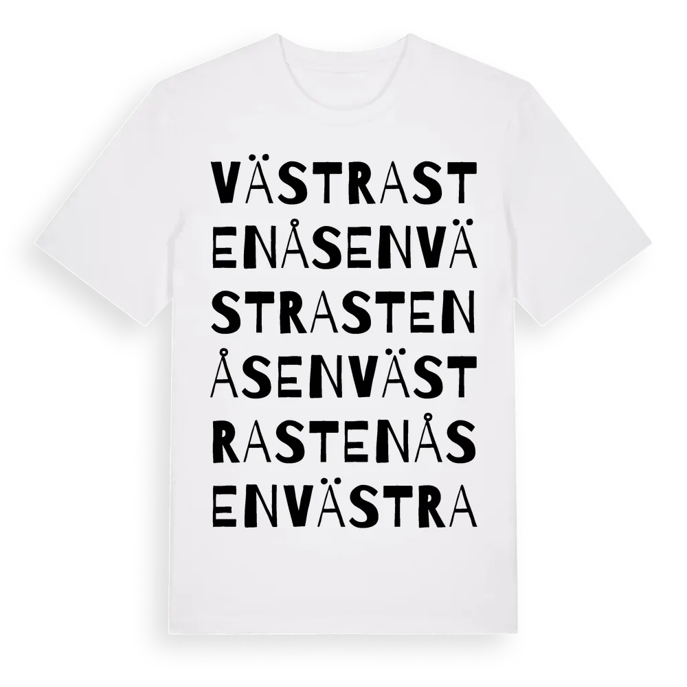 Västra Stenåsen ordlek t-shirt är inspirerad av stadsdelen Västra Stenåsen i Värmlands län, Sverige. Tröjan är designad för dig som har en speciell koppling till platsen – oavsett om du bor här, har rötterna här eller bara älskar Västra Stenåsen.