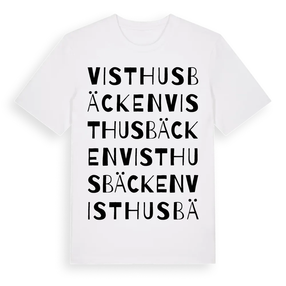 Visthusbäcken ordlek t-shirt är inspirerad av Visthusbäcken i Värmlands län, Sverige. Tröjan är designad för dig som har en speciell koppling till platsen – oavsett om du bor här, har rötterna här eller bara älskar Visthusbäcken.