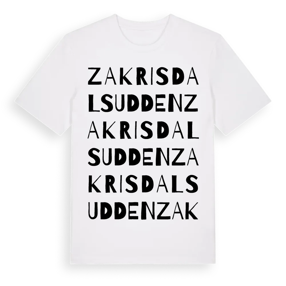 Zakrisdalsudden ordlek t-shirt är inspirerad av stadsdelen Zakrisdalsudden i Värmlands län, Sverige. Tröjan är designad för dig som har en speciell koppling till platsen – oavsett om du bor här, har rötterna här eller bara älskar Zakrisdalsudden.