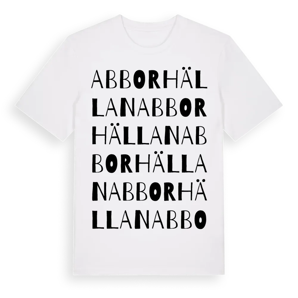 Abborhällan ordlek t-shirt är inspirerad av Abborhällan i Västerbottens län, Sverige. Tröjan är designad för dig som har en speciell koppling till platsen – oavsett om du bor här, har rötterna här eller bara älskar Abborhällan.