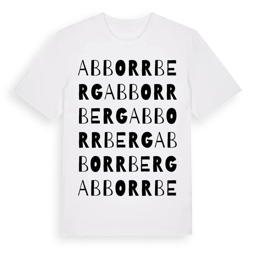 Abborrberg ordlek t-shirt är inspirerad av byn Abborrberg i Västerbottens län, Sverige. Tröjan är designad för dig som har en speciell koppling till platsen – oavsett om du bor här, har rötterna här eller bara älskar Abborrberg.
