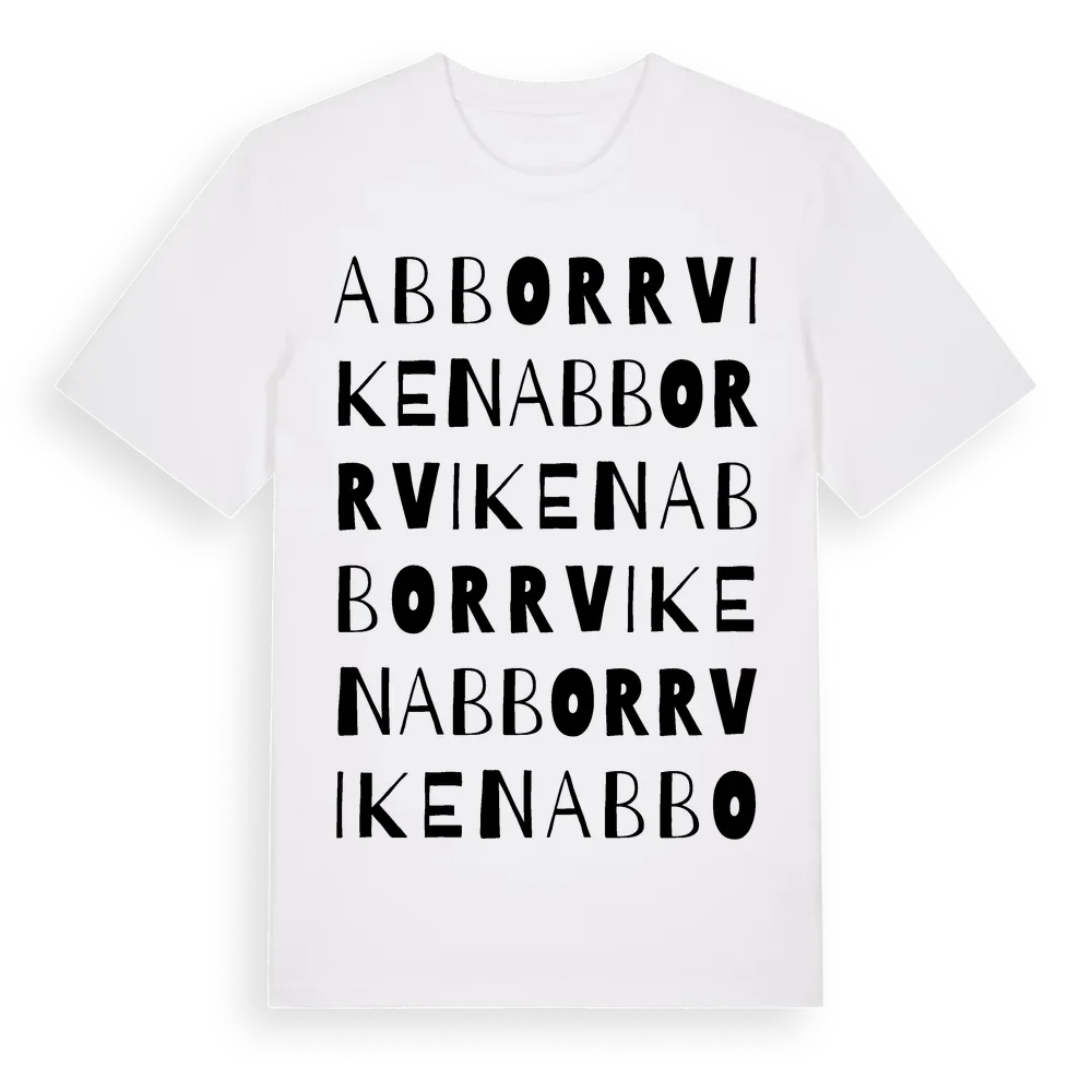 Abborrviken ordlek t-shirt är inspirerad av byn Abborrviken i Västerbottens län, Sverige. Tröjan är designad för dig som har en speciell koppling till platsen – oavsett om du bor här, har rötterna här eller bara älskar Abborrviken.