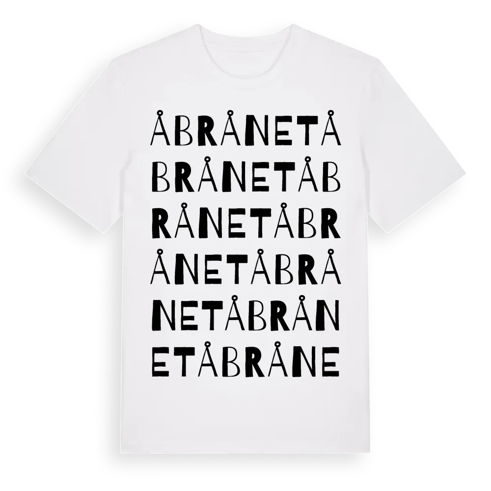 Åbrånet ordlek t-shirt är inspirerad av byn Åbrånet i Västerbottens län, Sverige. Tröjan är designad för dig som har en speciell koppling till platsen – oavsett om du bor här, har rötterna här eller bara älskar Åbrånet.