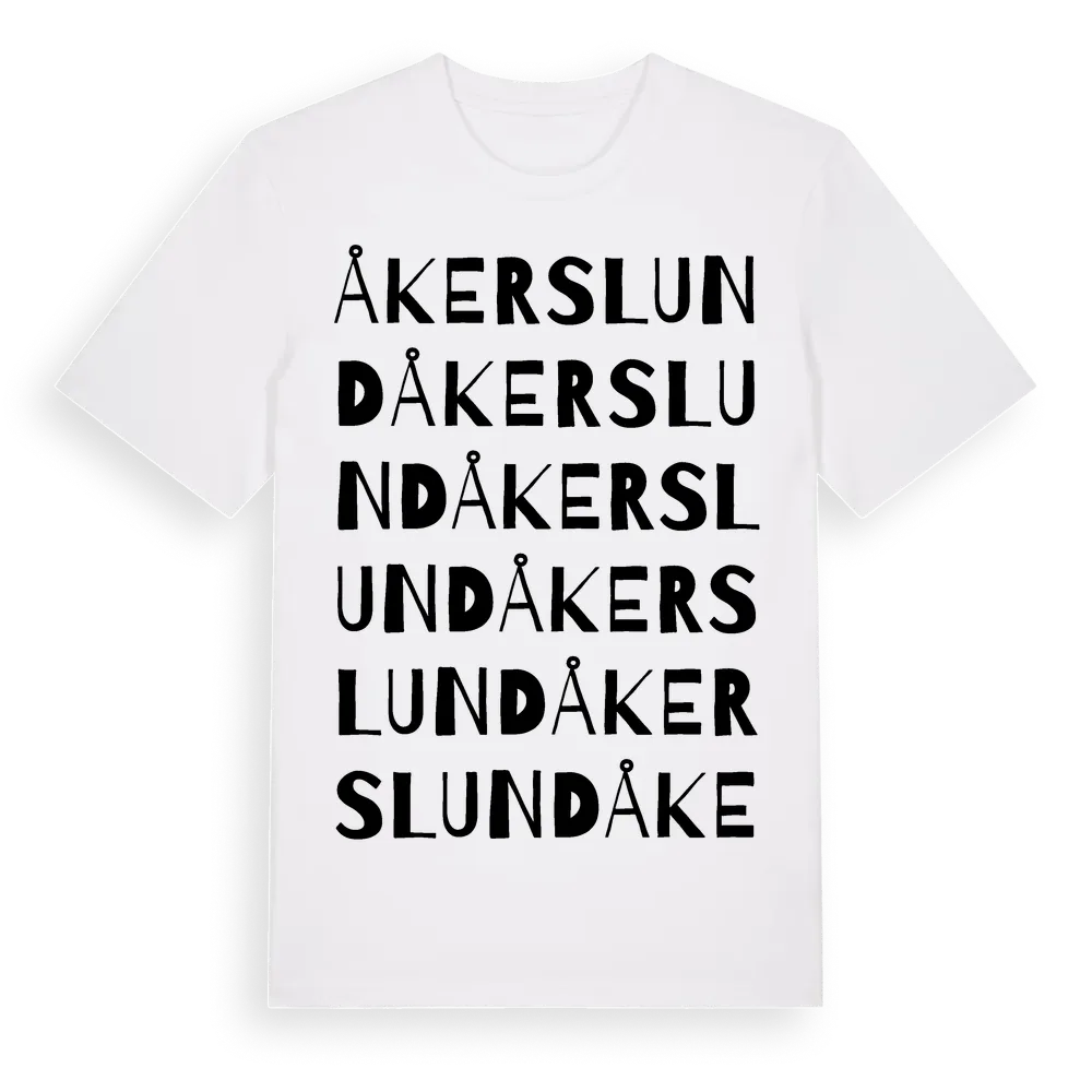 Åkerslund ordlek t-shirt är inspirerad av Åkerslund i Västerbottens län, Sverige. Tröjan är designad för dig som har en speciell koppling till platsen – oavsett om du bor här, har rötterna här eller bara älskar Åkerslund.