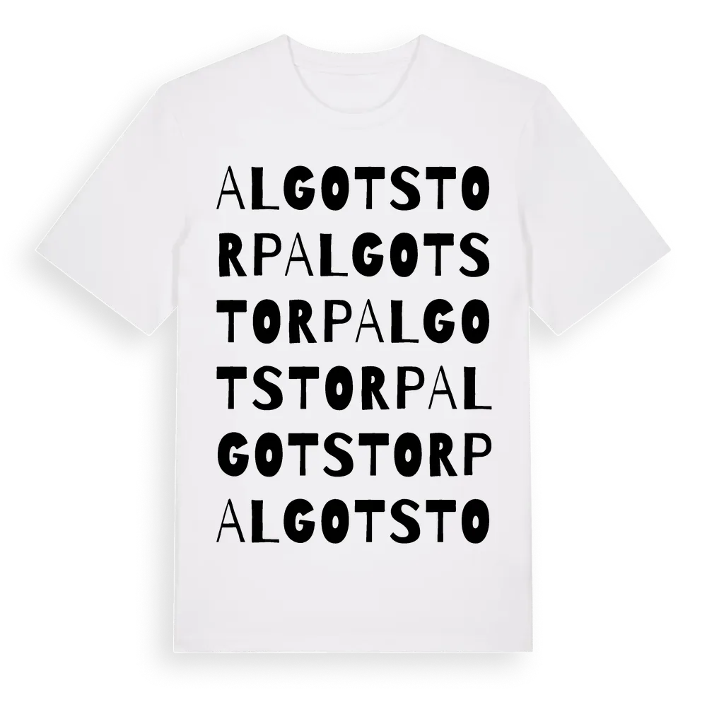 Algotstorp ordlek t-shirt är inspirerad av Algotstorp i Västerbottens län, Sverige. Tröjan är designad för dig som har en speciell koppling till platsen – oavsett om du bor här, har rötterna här eller bara älskar Algotstorp.