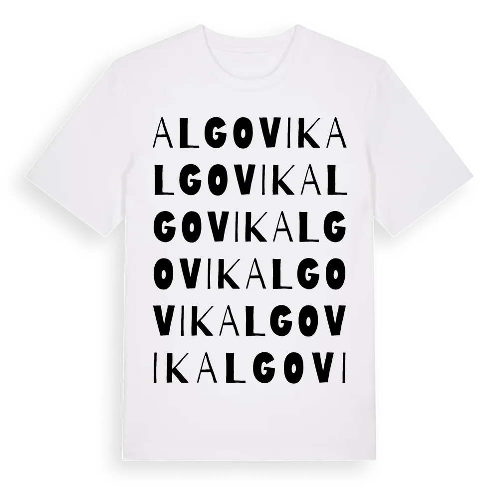 Algovik ordlek t-shirt är inspirerad av Algovik i Västerbottens län, Sverige. Tröjan är designad för dig som har en speciell koppling till platsen – oavsett om du bor här, har rötterna här eller bara älskar Algovik.