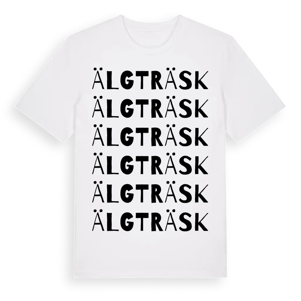 Älgträsk ordlek t-shirt är inspirerad av byn Älgträsk i Västerbottens län, Sverige. Tröjan är designad för dig som har en speciell koppling till platsen – oavsett om du bor här, har rötterna här eller bara älskar Älgträsk.