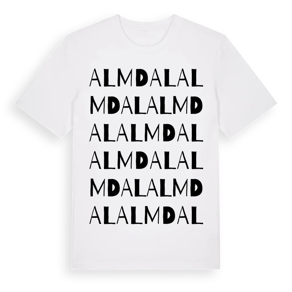 Almdal ordlek t-shirt är inspirerad av Almdal i Västerbottens län, Sverige. Tröjan är designad för dig som har en speciell koppling till platsen – oavsett om du bor här, har rötterna här eller bara älskar Almdal.