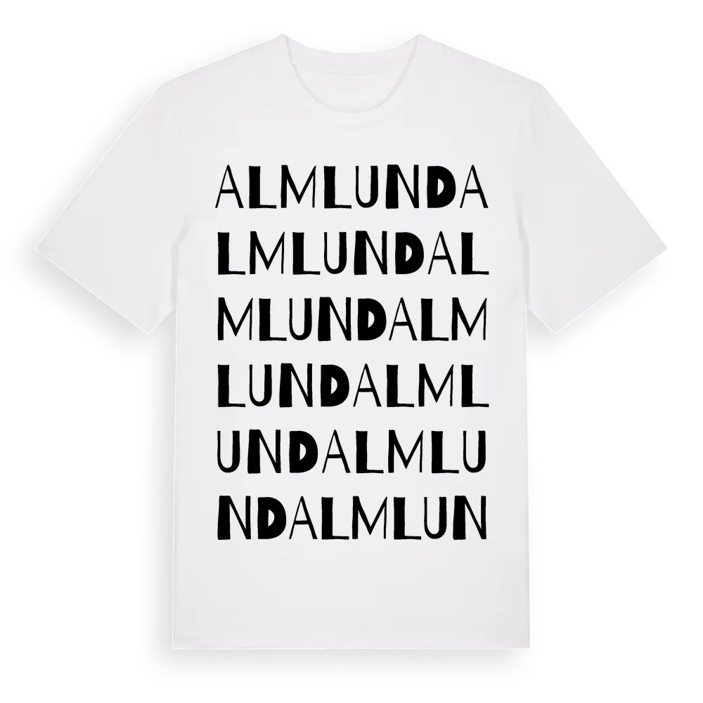 Almlund ordlek t-shirt är inspirerad av Almlund i Västerbottens län, Sverige. Tröjan är designad för dig som har en speciell koppling till platsen – oavsett om du bor här, har rötterna här eller bara älskar Almlund.